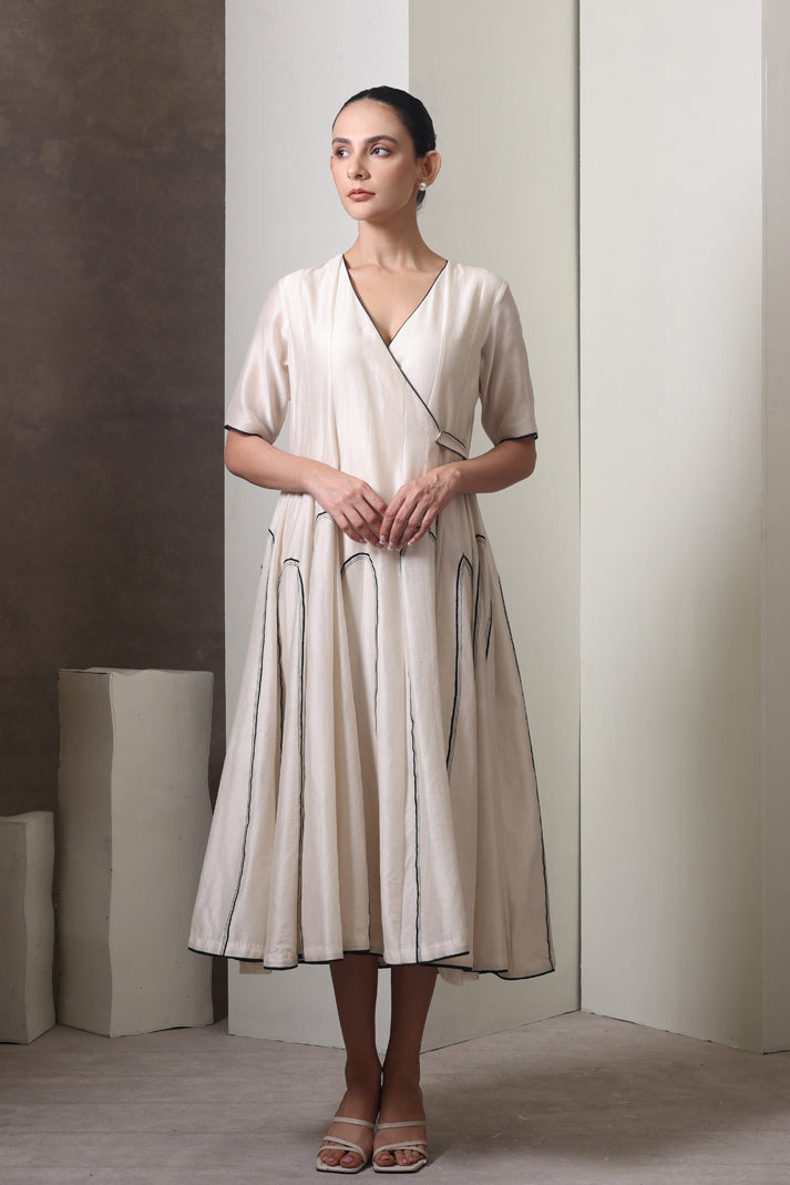 A flared wrap dress with contrast piping, enhanced by big dome-shaped embroidery for a refined, elegant look.
