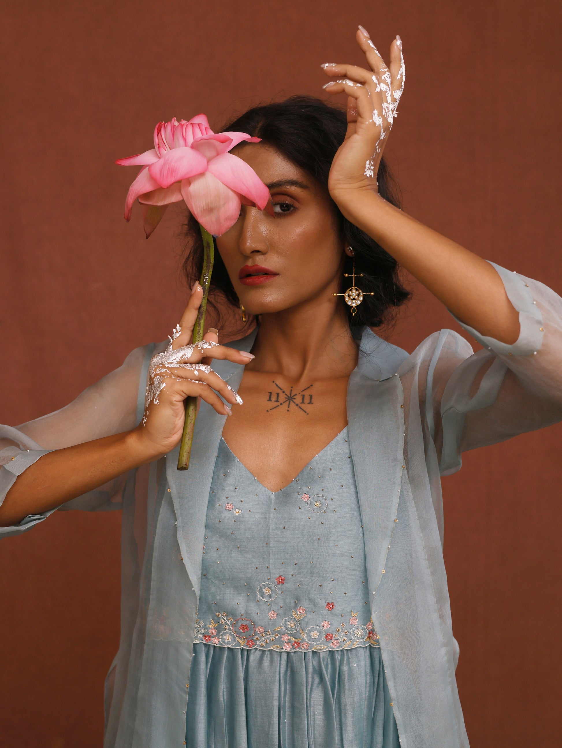 A gathered strap dress with delicate embroidery on the yoke, exuding a chic and feminine vibe. Paired with a transparent organza jacket, adding a layer of elegance and lightness to the look.