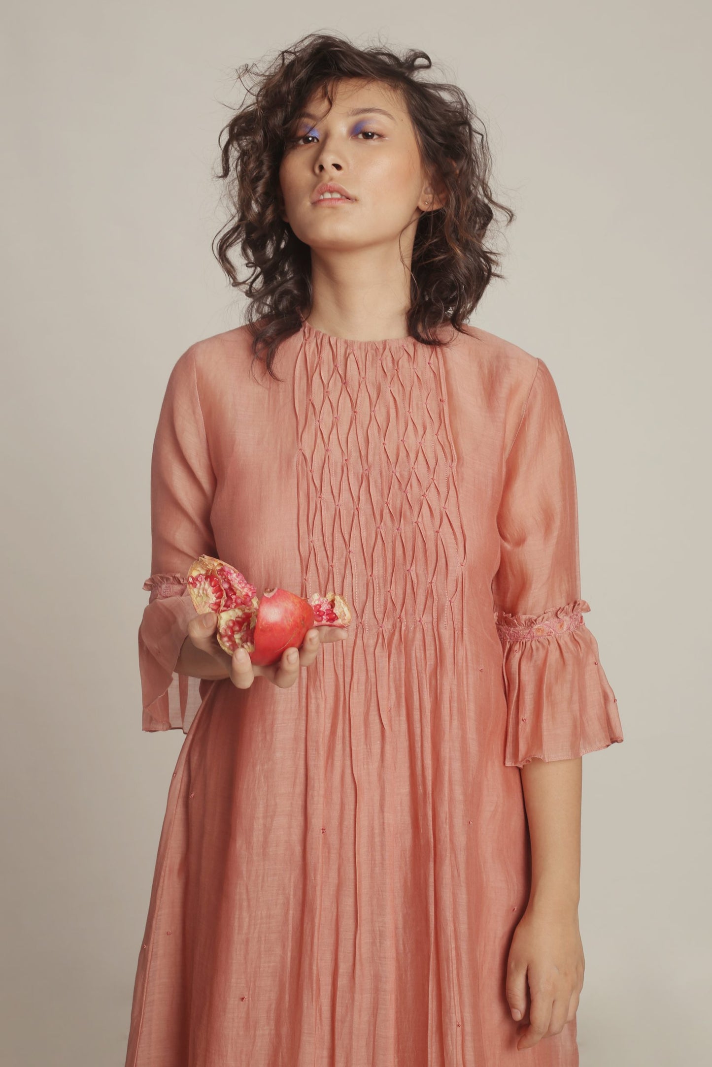 Smocked front with gathered bell sleeves and embroidered hem perfect for day and night summer.