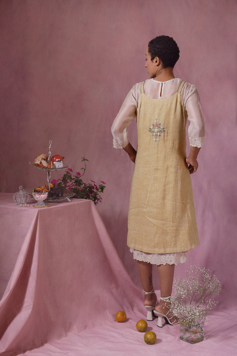 An angrakha strap jacket featuring hand embroidery on the waist, paired with a net-lining dress adorned with delicate cutwork floral embroidery for an elegant, detailed look.