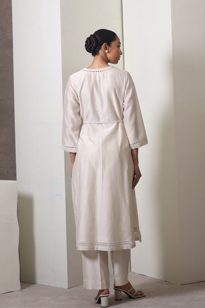A paneled kurta featuring intricate circular cutwork along the front placket, sleeves and hem paired with straight-fit pants and a sleek belt for a refined, modern look.