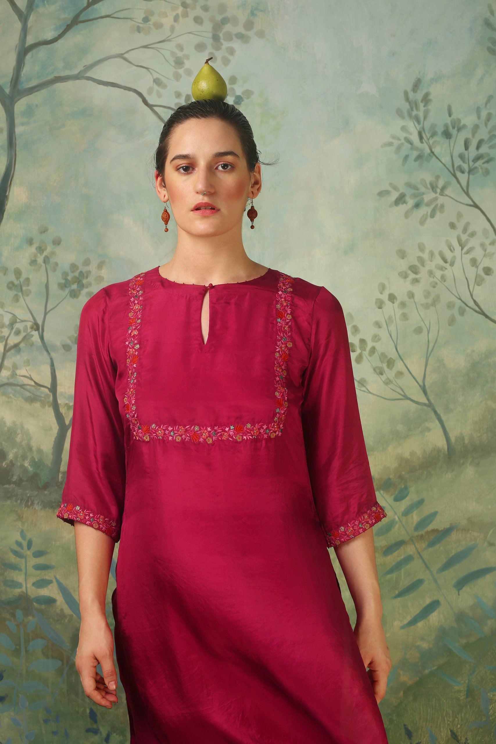 This silk kurta, adorned with intricate yoke-pattern embroidery, radiates timeless elegance. Paired with long flared pants, it creates a sophisticated and effortlessly chic ensemble.